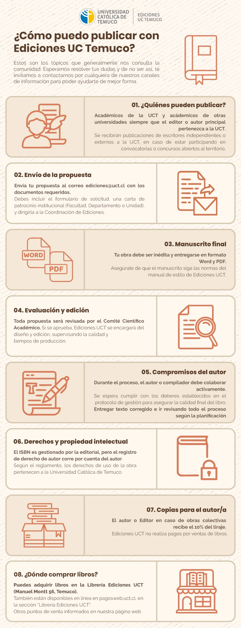 Ediciones UCT recibe propuestas de publicaciones en diferentes disciplinas del ámbito académico, y no académico, tanto de autores de la universidad como del medio literario externo (local y regional) que desarrollen temáticas afines a los intereses institucionales de publicación. Ediciones UC Temuco supervisa la calidad de los servicios y los plazos establecidos de acuerdo a cada proyecto.